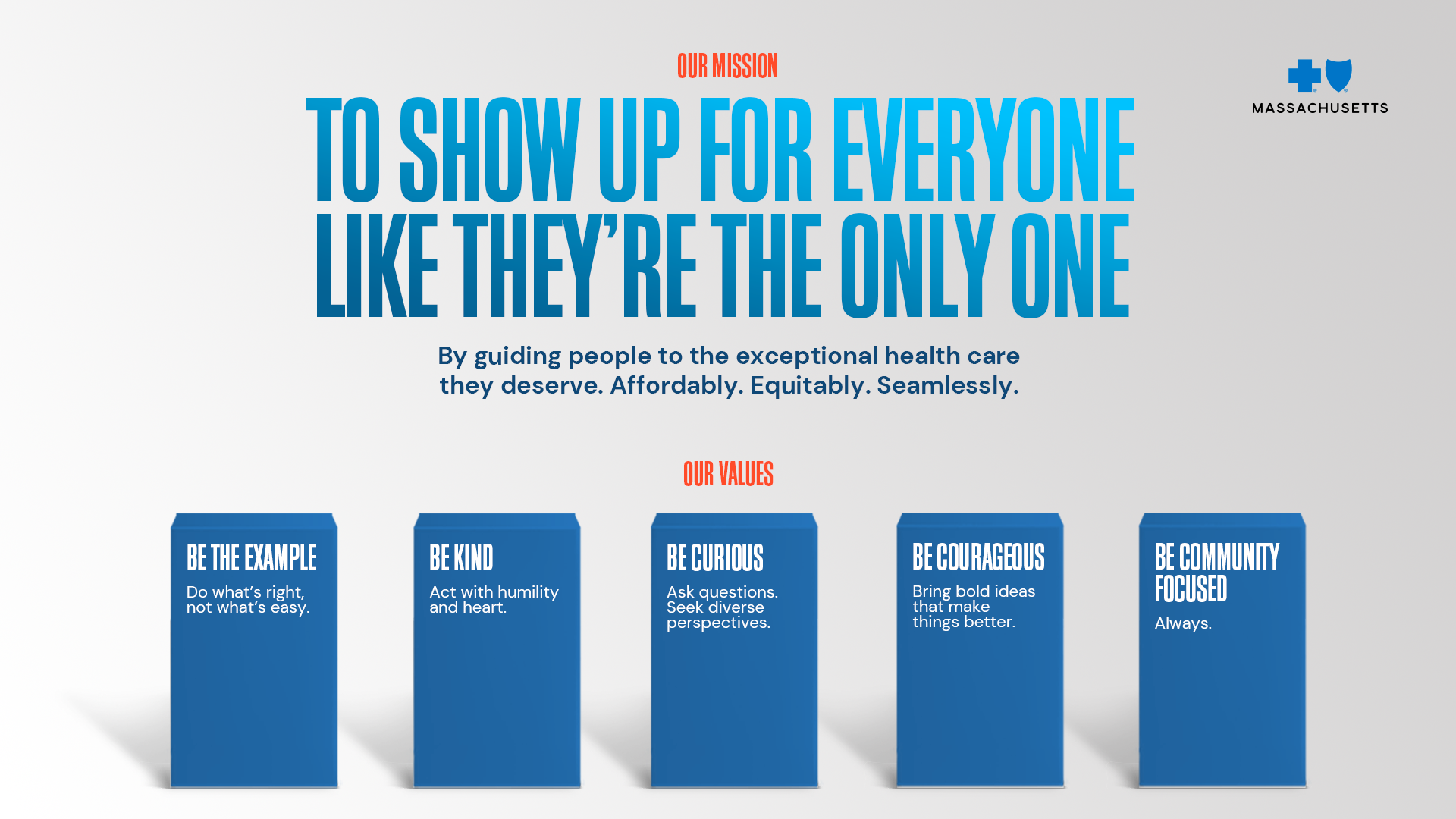 BCBS of Massachusetts tasked us to help them re-vamp their mission statement. Once the team helped them align their mission and values, my job was to bring it all to life in a compelling presentation for them to roll out at a huge internal conference. We also helped them get some social assets together to promote their new 5-step Checklist.